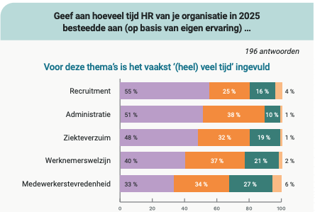 Figuur 2 – HR besteedt vooral (heel) veel tijd aan recruitment, administratie en ziekteverzuim – precies de dossiers waar AI volgens HR het meeste kan ontlasten.