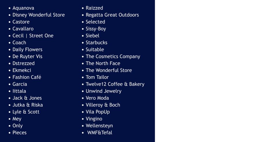 Ook het homewearsegment is aanzienlijk uitgebreid: met de openingen van Iittala, Sissy-Boy en Aquanova biedt het Centre nu een nog sterker en gevarieerder aanbod. Daarnaast heeft The Cosmetics Company Batavia Stad verrijkt met een omvangrijk beautyconcept, waarin premium merken zoals Jo Malone, Tom Ford en La Mer centraal staan.