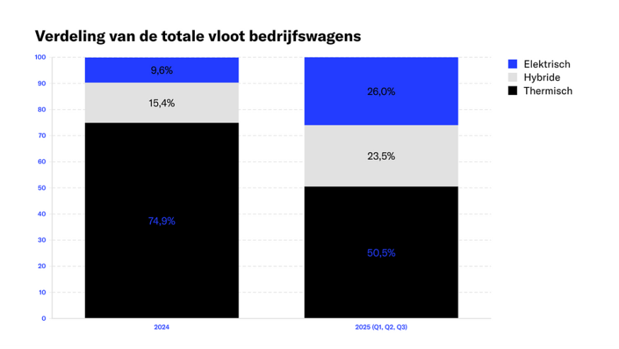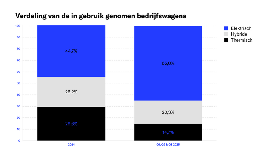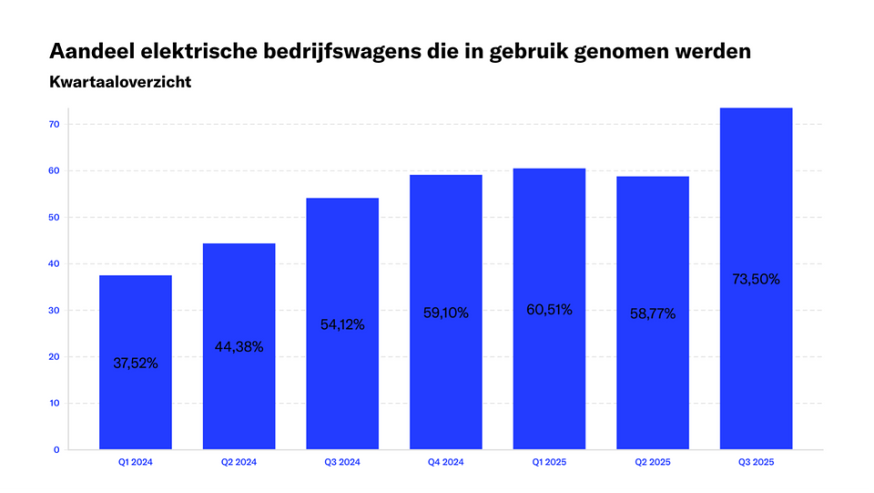 Van de bedrijfswagen die in het derde kwartaal van 2025 toegevoegd werden aan het wagenpark was 73,5% elektrisch. In de eerste helft van 2025 was dat nog 60% en in 2024 amper 44,7%.